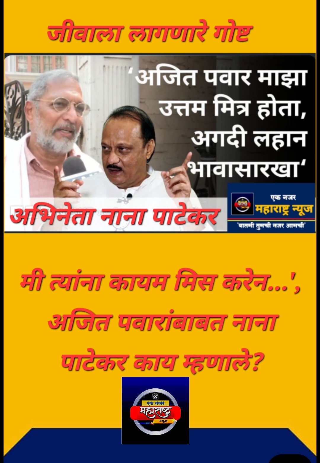 एक नजर महाराष्ट्र वरती                                     अजित पवार 19-20 वर्षांचे होते, तेव्हापासून माझे मित्र – नाना पाटेकर                                     मुंबईत 12 फेब्रुवारीला उपमुख्यमंत्री सुनेत्रा पवार यांची भेट घेतल्यानंतर पत्रकारांशी बोलताना हे वक्तव्य केलं. ते म्हणाले की “मी त्यांचं सांत्वन केलं, पण त्यांचं दुःख त्याच समजू शकतात. त्यांनी मोठी जबाबदारी खांद्यांवर घेतली आहे, पण त्यांच्यावरही डोंगराएवढं दुःख कोसळलंय.”