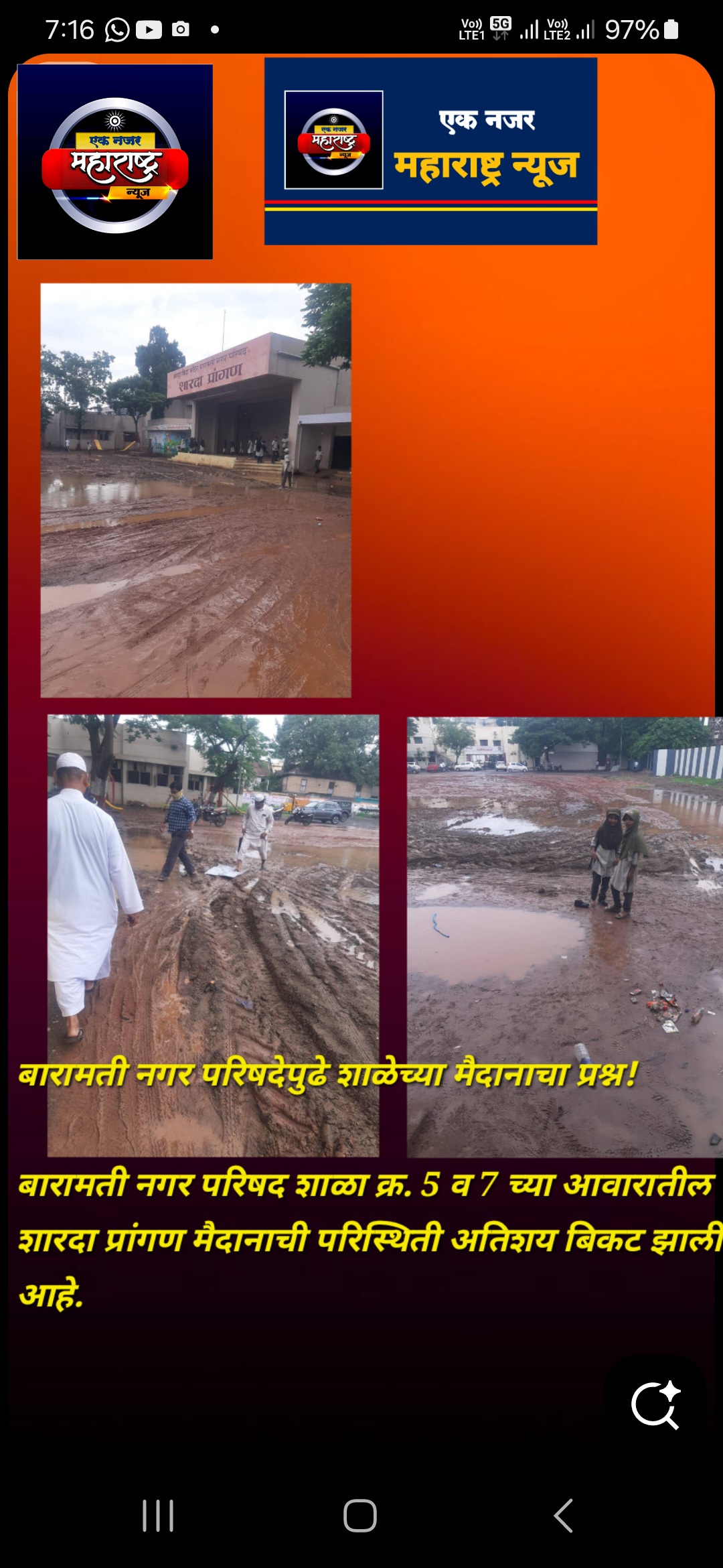 बारामती नगर परिषद शाळा क्र. 5 व 7 च्या आवारातील शारदा प्रांगण मैदानाची परिस्थिती अतिशय बिकट झाली आहे. मैदानात पावसाचे पाणी साचून राहिल्यामुळे मुलांना खेळता येत नाही तसेच परिसर चिखलमय झाल्याने शाळकरी विद्यार्थ्यांना मोठ्या अडचणींचा सामना करावा लागत आहे.