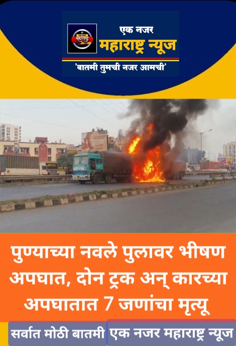 मोठी बातमी समोर येत आहे, पुण्यातील नवले पुलावर दोन ट्रक आणि एका कारचा भीषण अपघात झाला आहे. या अपघातानंतर ट्रकला आग लागल्याची घटना घडली, या अपघातामध्ये सात जणांचा मृत्यू झाला आहे. एक नजर महाराष्ट्र न्यूज पुणे नवले ब्रिज पुण्यातून मोठी बातमी समोर येत आहे, पुण्याच्या नवले पुलावर भीषण अपघात झाला आहे. या अपघातानंतर दोन ट्रकला आग लागली असून, या दोन ट्रकच्यामध्ये एक कार अडकली आहे. या अपघातामध्ये सात जणांचा मृत्यू झाल्याची प्राथमिक माहिती समोर येत आहे. समोर आलेल्या माहितीनुसार नवले पुलावर दोन ट्रकची समोरा समोर धडकी झाली, त्यानंतर या दोन ट्रकच्यामध्ये एक कार अडकल्याची घटना घडली आहे. अपघातानंतर दोन्ही ट्रकने पेट घेतला आहे. साताऱ्याच्या दिशेकडून पुण्याकडे येणाऱ्या दोन ट्रकचा अपघात झाला आहे. या अपघातामध्ये दोन ट्रकच्यामध्ये एक चारचाकी वाहन अडकल्याची माहिती समोर येत आहे. या अपघातानंतर या दोन्ही ट्रकला आग लागली, या घटनेत सात जणांचा मृत्यू झाला असून, मृतांची संख्या आणखी वाढू शकते, अशी भीती व्यक्त केली जात दरम्यान दोन ट्रक आणि एका कारचा अपघात झाल्यामुळे हा रस्ता आता वाहतुकीसाठी बंद झाला आहे, त्यामुळे या परिसरात प्रचंड प्रमाणात वाहतूक कोंडी निर्माण झाली आहे, वाहतूक कोंडीमुळे प्रवाशांचे हात सुरू आहेत. या अपघातामध्ये तीनही वाहनांचं प्रचंड नुकसान झालं आहे. दरम्यान घटनेची माहिती मिळताच अग्निशमन दलाचं पथक घटनास्थळी दाखल झालं असून, आगीवर नियंत्रण मिळवण्यात यश आलं आहे. मात्र अजूनही ही कार या दोन्ही ट्रकच्यामध्ये अडकलेलीच आहे, तिला बाहेर काढण्याचा प्रयत्न आता अग्निशमन दल आणि पुणे पोलिसांकडून सुरू आहे.