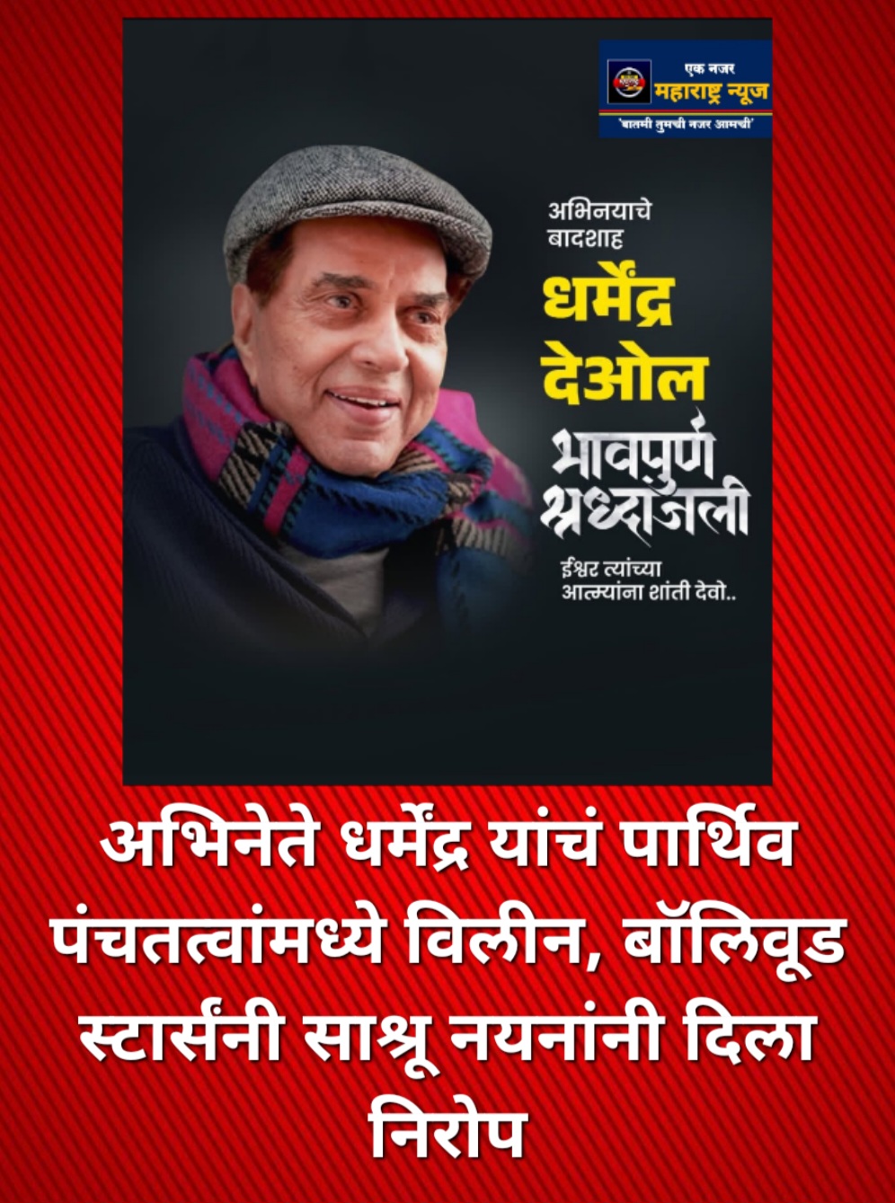 एक नजर महाराष्ट्र न्युज मुंबई : ज्येष्ठ अभिनेते धर्मेंद्र यांचं निधन झालं आहे, त्यांनी वयाच्या 89 व्या वर्षी अखेरचा श्वास घेतला, धर्मेंद्र यांच्या निधनानं बॉलिवूडवर शोककळा पसरली आहे. बॉलिवूडचे ही-मॅन, प्रसिद्ध अभिनेते धर्मेंद्र यांचं आज सकाळी 9.30च्या सुमारास निधन झालं आहे. वयाच्या 89व्या वर्षी धर्मेंद्र यांनी अखेरचा श्वास घेतला. धर्मेंद्र हे गेल्या काही दिवसांपासून आजारी होते. त्यांना दोन आठवड्यापूर्वी रुग्णालयात दाखलही करण्यात आलं होतं. प्रकृतीत फरक पडल्याने त्यांना डिस्चार्जही देण्यात आला होता. पण आज सकाळी त्यांची प्रकृती अधिकच बिघडल्याने त्यांनी अखेरचा श्वास घेतला. धर्मेंद्र यांच्या निधनाची त्यांच्या कुटुंबियांनी अधिकृत घोषणा केलेली नाहीये. पण त्यांचं संपूर्ण कुटुंब विलेपार्ले येथील स्मशानभूमीत पोहोचलं आहे. तसेच बॉलिवडूचे अनेक कलाकारही स्मशानभूमीत दाखल झाले आहेत. प्रसिद्ध अभिनेते अमिताभ बच्चन, अभिषेक बच्चन आणि आमिर खान हे सुद्धा धर्मेंद्र यांना अखेरचा निरोप देण्यासाठी स्मशानभूमीत आले आहेत.