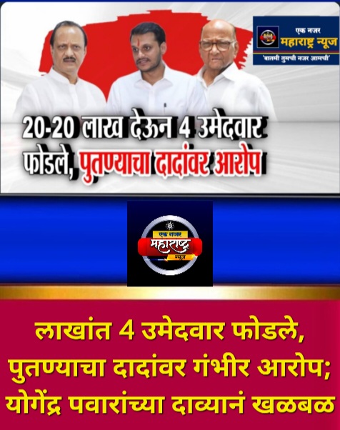 एक नजर महाराष्ट्र न्यूज मुख्य संपादक भीमसेन जाधव बारामती: नगरपालिकामध्ये पुन्हा एकदा राष्ट्रवादी काँग्रेसमधील दोन गटांमध्ये मुख्य लढत पाहायला मिळत आहे. शरद पवारांच्या राष्ट्रवादी काँग्रेसचे नेते योगेंद्र पवारांनी अजित पवारांवर गंभीर आरोप केले आहेत. बारामती नगरपालिकेच्या निवडणुकीत अजित पवारांनी त्यांचे चार उमेदवार 20-20 लाख रुपये देऊन फोडले आणि त्यांना माघार घ्यायला लावली, असे योगेंद्र पवार म्हणाले नगरपालिकेच्या एकूण 41 जागा आहेत, त्यापैकी अजित पवारांच्या राष्ट्रवादीचे आठ उमेदवार बिनविरोध निवडून आले आहेत. उर्वरित 33 जागांवर मतदान होणार आहे. याच आठ बिनविरोध जागांपैकी चार जागांवर शरद पवारांच्या राष्ट्रवादीच्या उमेदवारांना 20-20 लाख रुपये देऊन माघार घ्यायला लावल्याचाआरोप योगेंद्र पवारांनी केला आहे. दुसरीकडे, अजित पवारांच्या गोटातून या आरोपांना “अफवा” संबोधून, बारामतीकरांचा योगेंद्र पवारांवर विश्वास नसल्याचे म्हटले जात आहे. ही निवडणूक विकासाची असल्याचे अजित पवारांनी स्पष्ट केले आहे.