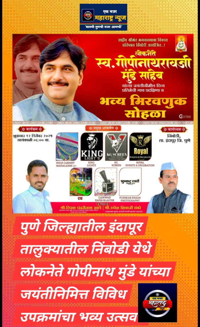 राष्ट्रीय श्री संत भगवानबाबा विकास प्रतिष्ठाण निंबोडी आयोजित लोकनेते व माजी ग्रामविकास मंत्री मा. गोपीनाथ मुंडे यांच्या जयंतीनिमित्त विविध सामाजिक, सांस्कृतिक व क्रीडा उपक्रमांचा भव्य उत्सव निंबोडी येथे उत्साहात साजरा होणार आहे.