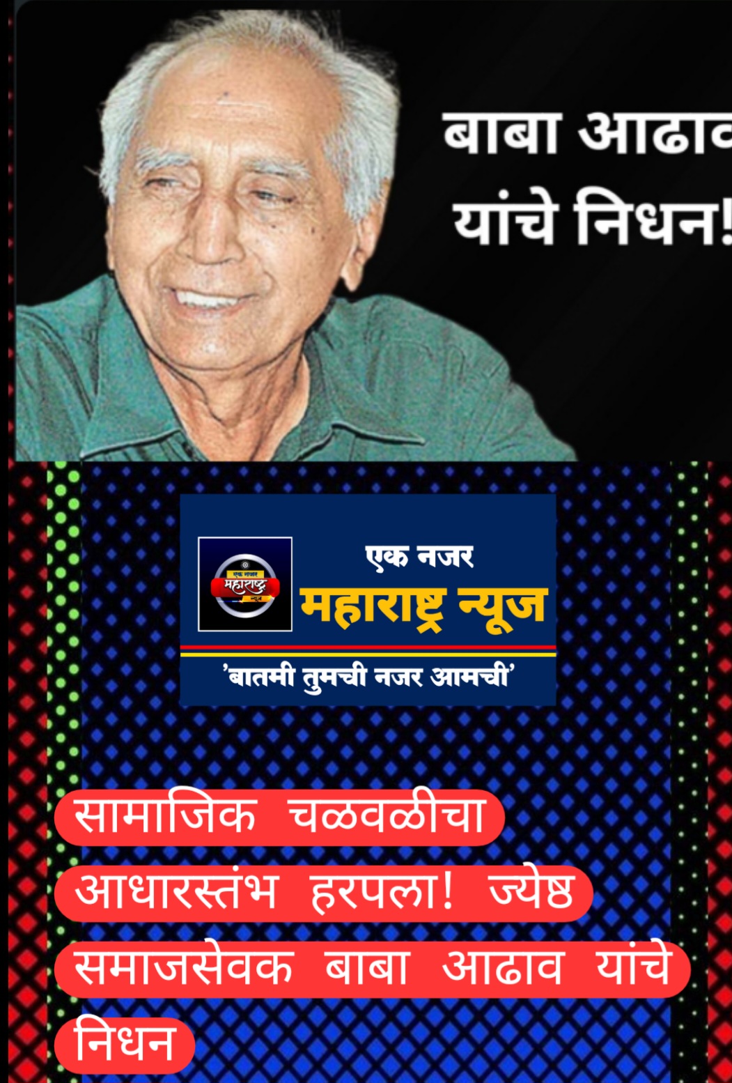 एक नजर महाराष्ट्र न्यूज महाराष्ट्राच्या सामाजिक आणि श्रमिक चळवळीचे आधारस्तंभ, ज्येष्ठ समाजसेवक बाबा आढाव यांचे निधन झाले आहे.महाराष्ट्राच्या सामाजिक आणि श्रमिक चळवळीचे आधारस्तंभ, ज्येष्ठ समाजसेवक डॉ. बाबासाहेब पांडुरंग आढाव (बाबा आढाव) यांचे आज (सोमवार, 8 डिसेंबर) निधन झाले. प्रकृती खालावल्यामुळे त्यांना पुण्यातील पूना हॉस्पिटलमध्ये उपचारासाठी दाखल करण्यात आले होते. तेथे त्यांच्यावर अतिदक्षता विभागात (ICU) उपचार सुरू असताना त्यांनी अखेरचा श्वास घेतला. डॉ. बाबा आढाव यांच्या निधनाने कष्टकरी आणि वंचित समाजासाठी लढणारा एक निःस्वार्थ नेता काळाच्या पडद्याआड गेला आहे.