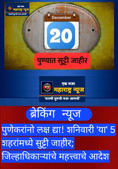 पुणेकरांनो लक्ष द्या! शनिवारी ‘या’ 5 शहरांमध्ये सुट्टी जाहीर; जिल्हाधिकाऱ्यांचे महत्त्वाचे आदेश पुणे जिल्ह्यातील काही महत्त्वाच्या नगरपरिषदांसाठी उद्याचा दिवस (शनिवार, 20 डिसेंबर) अत्यंत महत्त्वाचा ठरणार आहे.