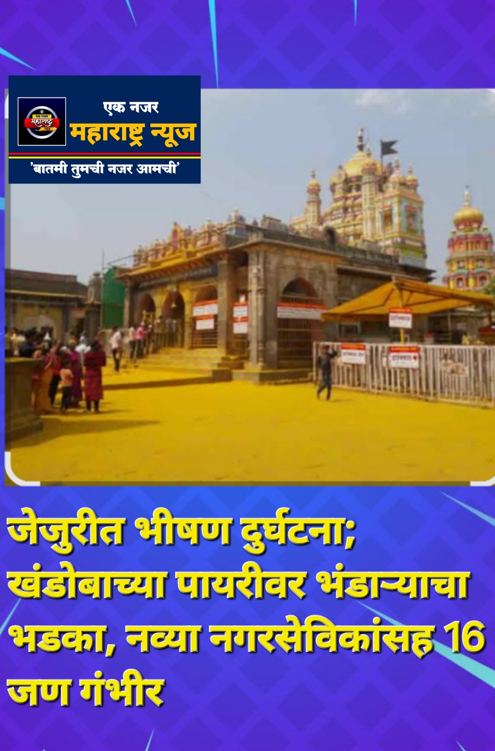 एक नजर महाराष्ट्र न्युज जेजुरी : निवडणूकीचा निकाल लागल्यानंतर विजयी जल्लोष करताना अत्यंत दुर्दैवी घटना घडली आहे. जेजुरीच्या पायरीवर भंडारा अर्पण करताना अचानक भडका उडाला आणि त्यात 16 जण गंभीर जखमी झाल्याची माहिती आहे.जेजुरीत मतमोजणी संपल्यानंतर विजयी जल्लोषाला शोकाची छाया पडेल, अशी धक्कादायक घटना जेजुरीत घडली. खंडोबा गडाच्या पहिल्या पायरीवर भाविक व कार्यकर्त्यांनी भंडारा अर्पण करताना अचानक भीषण भडका उडून किमान 16 जण गंभीर भाजल्याची घटना दुपारी सुमारे 3 वाजता घडली. जखमींमध्ये दोन नव्याने निवडून आलेल्या राष्ट्रवादी काँग्रेसच्या नगरसेविकांसह अनेक महिला, तरुणांचा समावेश आहे.घटनेनंतर परिसरात मोठी दहशत निर्माण झाली. क्षणभरात भंडाऱ्याने पेट घेतला आणि जोरदार आवाजासह स्फोट होऊन आजूबाजूचे लोक होरपळले. भाजलेल्या जखमींना तातडीने जेजुरीतील खाजगी तसेच शासकीय रुग्णालयात दाखल करण्यात आले असून काहींना पुढील उपचारासाठी पुण्यात हलविण्याचीही शक्यता व्यक्त केली जात आहे. पोलिसांनी तत्काळ घटनास्थळी धाव घेत तपास सुरू केला आहेमल्हार नाट्यगृहात मतमोजणी पूर्ण होऊन निकाल जाहीर होताच राष्ट्रवादी काँग्रेसचे विजयी उमेदवार, समर्थक व कार्यकर्ते खंडोबाच्या दर्शनासाठी गडाच्या पहिल्या पायरीवर गेले होते. येथे भाविकांनी मोठ्या प्रमाणावर भंडारा उधळताना वापरलेल्या भंडाऱ्याने अचानक पेट घेतला. अत्यंत ज्वालाग्राही घटक मिश्रित असल्यामुळे भडका एकदम मोठा झाला आणि अनेक जण त्यात सापडले. स्फोटासारखा आवाज झाल्यानंतर क्षणात परिसर धुराने व्यापला. काही काळासाठी तिथे प्रचंड घबराट पसरली होती.घटना अतिदुर्दैवी, भेसळयुक्त भंडाऱ्यावर कठोर कारवाई करणार असल्याचे नव्या नगराध्यक्ष जयदीप बारभाई यांनी सांगितले. निवडून आलेले नगराध्यक्ष जयदीप बारभाई म्हणाले, गडाच्या पहिल्या पायरीवर घडलेली दुर्घटना अतिशय दुर्दैवी आहे. ज्वालाग्राही आणि भेसळयुक्त भंडाऱ्याचा वापर झाल्यामुळे भडका उडाल्याची स्पष्ट शक्यता आहे. पुढील काळात शहरात विक्री होणाऱ्या अशा भेसळयुक्त भंडाऱ्यावर कडक कारवाई केली जाईल. नगरपालिका यासाठी विशेष पथक उभारणार आहे.