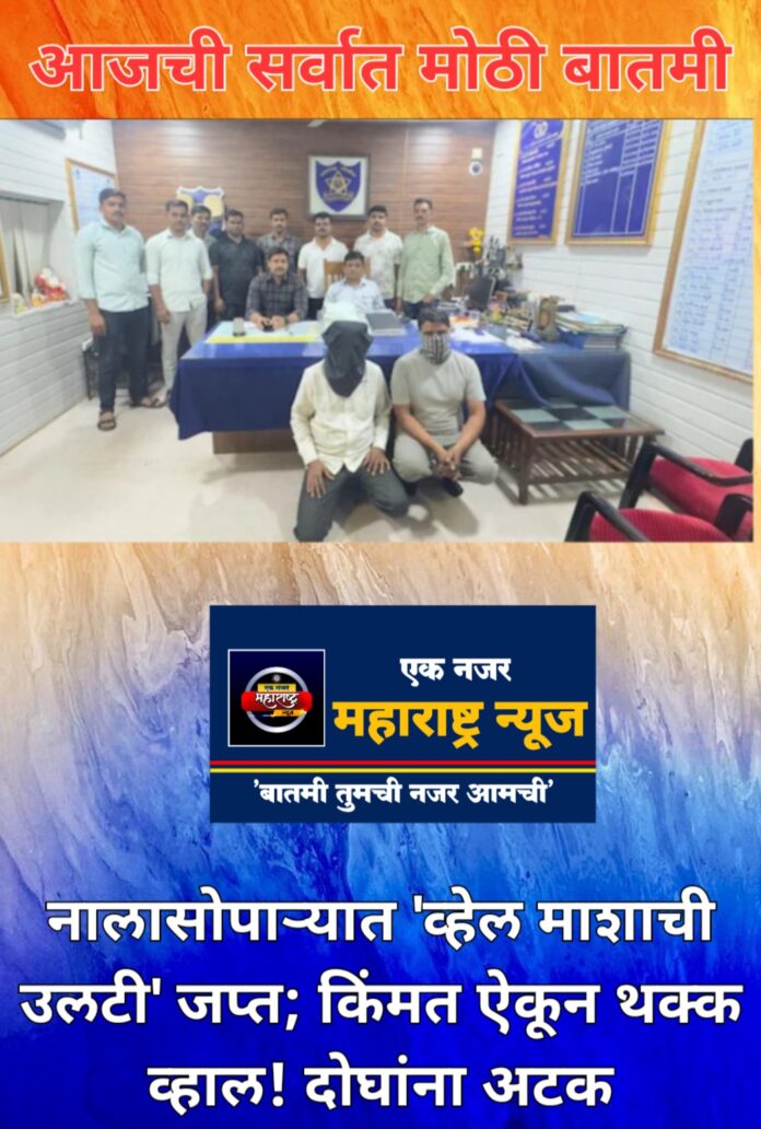 एक नजर महाराष्ट्र न्यूज सर्वात मोठी बातमी मुंबई 🙁 नालासोपारा )सुमारे 1 कोटी 85 लाख 80 हजार रुपये किमतीची व्हेल माशाची उलटी पोलिसांनी जप्त केली आहे. उलटीचं वजन सुमारे 1 किलो 858 ग्रॅम आहे. या कारवाईत पोलिसांनी दोन तस्करांना बेड्या ठोकल्या आहेत. नालासोपारा येथील तुळींज पोलिस ठाण्याच्या गुन्हे प्रकटीकरण शाखेने प्रतिबंधित अशा व्हेल माशाच्या उलटीची तस्करी रोखण्यात मोठे यश मिळवले आहे. तुळींज पोलिसांनी एका मोठ्या तस्करीचा पर्दाफाश केला आहे. सुमारे 1 कोटी 85 लाख 80 हजार रुपये किमतीची व्हेल माशाची उलटी पोलिसांनी जप्त केली आहे. उलटीचं वजन सुमारे 1 किलो 858 ग्रॅम आहे. या कारवाईत पोलिसांनी दोन तस्करांना बेड्या ठोकल्या आहेत.